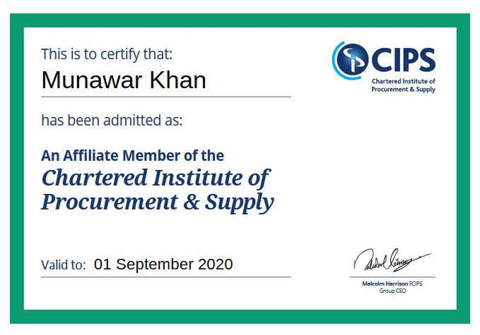 Pakistan Institute of Procurement & Supply Management is APPROVED STUDY CENTRE OF CIPS UK (Centre number: 005749975) in Pakistan and first institute for Procurement & Supply Chain studies. We intend to provide world best training programs and certifications from famous & recognized awarding authorities. We have highly trained & experienced professionals with practical exposure of world leading organizations in the area of Procurement, Supply Chain, Human Resource and Finance. We have membership of CIPS ( Chartered Institutes of UK) and providing trainings & Coaching services to different organizations.